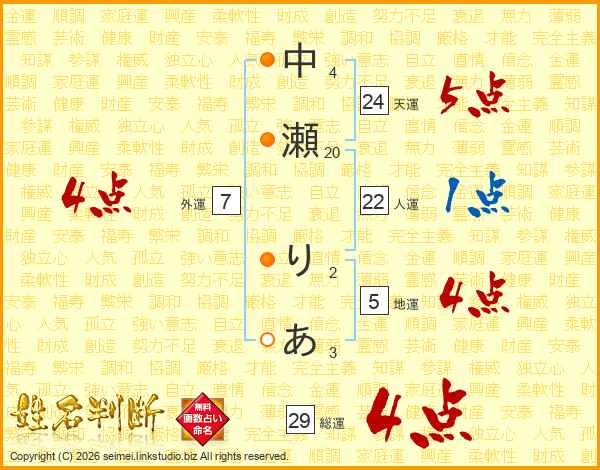 中瀬りあさんの総運は29画の4点!