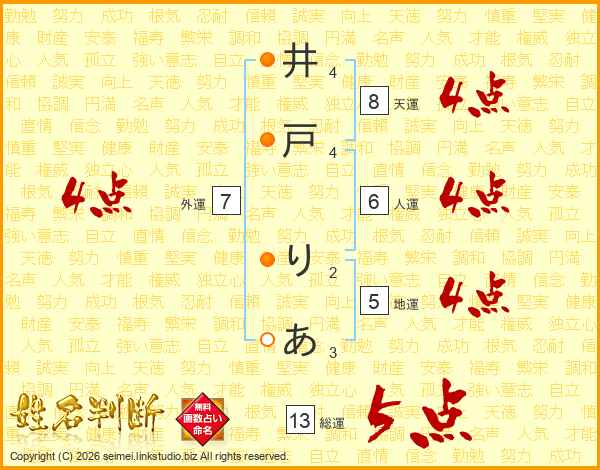 井戸りあさんの総運は13画の5点!