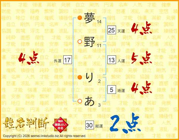 夢野りあさんの天運は25画の4点!
