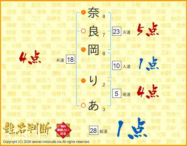 奈(8画)良(7画)岡(8画) り(2画)あ(3画)