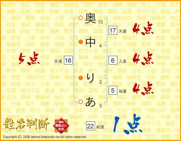 奥中りあさんの総運は22画の1点!