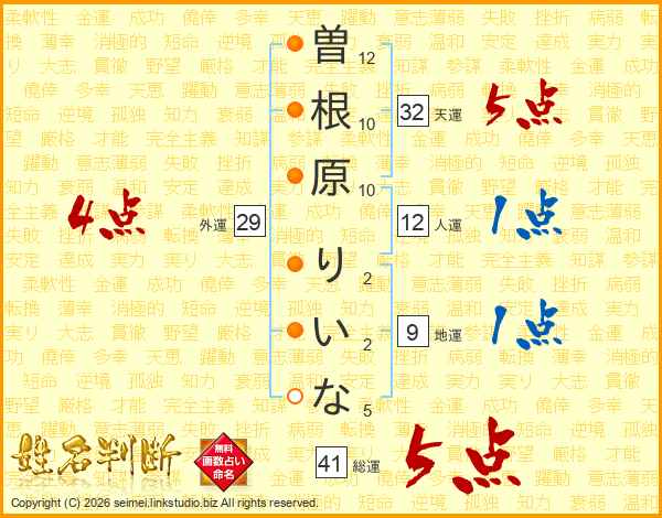 曽(12画)根(10画)原(10画) り(2画)い(2画)な(5画)