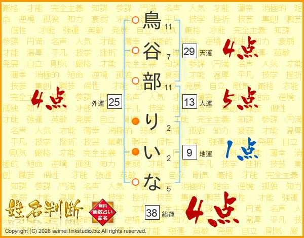 鳥(11画)谷(7画)部(11画) り(2画)い(2画)な(5画)