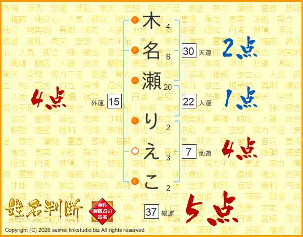 木(4画)名(6画)瀬(20画) り(2画)え(3画)こ(2画)