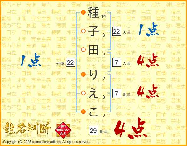 種(14画)子(3画)田(5画) り(2画)え(3画)こ(2画)