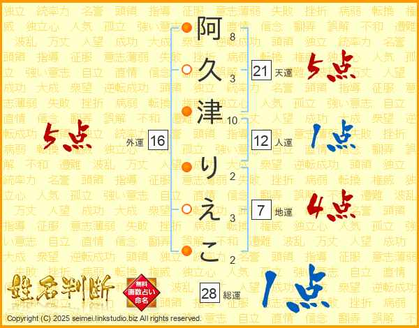 阿(8画)久(3画)津(10画) り(2画)え(3画)こ(2画)