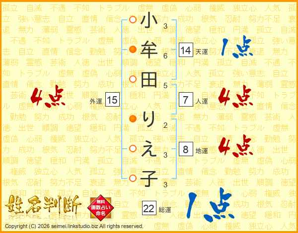 小(3画)牟(6画)田(5画) り(2画)え(3画)子(3画)
