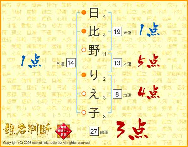 日(4画)比(4画)野(11画) り(2画)え(3画)子(3画)