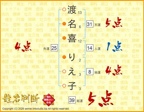 渡(13画)名(6画)喜(12画) り(2画)え(3画)子(3画)
