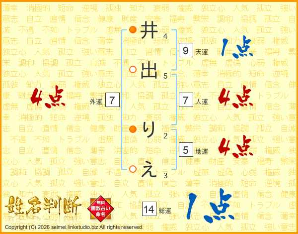 生活面を象徴する運勢です。外部から受ける影響力を表し、結婚運、家庭運や職場、環境への順応性を表します。総運から人運を引いた画数。姓や名が1文字の場合を除く。