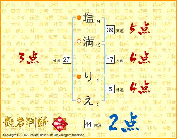 生活面を象徴する運勢です。外部から受ける影響力を表し、結婚運、家庭運や職場、環境への順応性を表します。総運から人運を引いた画数。姓や名が1文字の場合を除く。