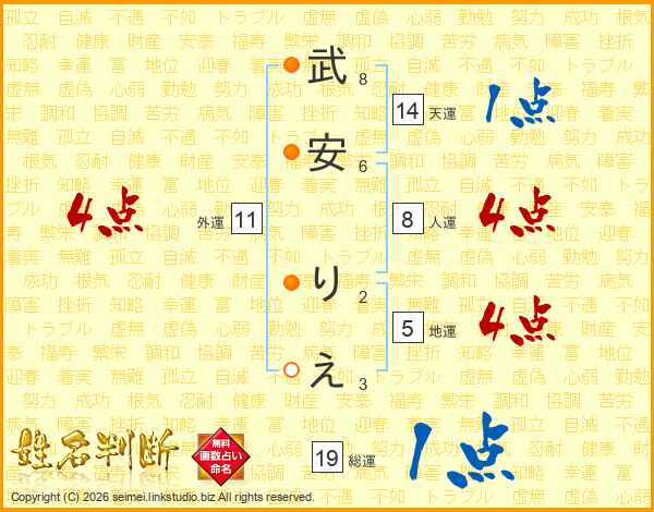 生活面を象徴する運勢です。外部から受ける影響力を表し、結婚運、家庭運や職場、環境への順応性を表します。総運から人運を引いた画数。姓や名が1文字の場合を除く。