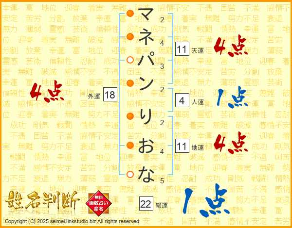 マ(2画)ネ(4画)パ(3画)ン(2画) り(2画)お(4画)な(5画)