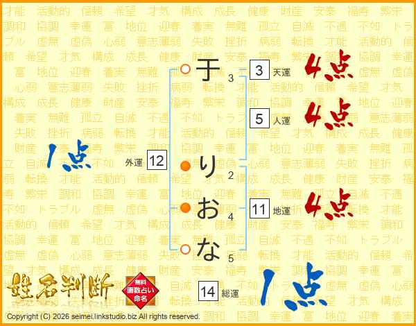 生活面を象徴する運勢です。外部から受ける影響力を表し、結婚運、家庭運や職場、環境への順応性を表します。総運から人運を引いた画数。姓や名が1文字の場合を除く。