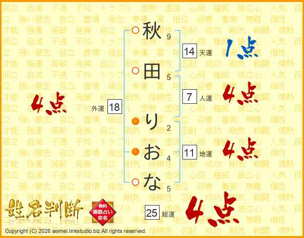 生活面を象徴する運勢です。外部から受ける影響力を表し、結婚運、家庭運や職場、環境への順応性を表します。総運から人運を引いた画数。姓や名が1文字の場合を除く。