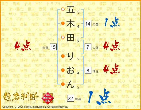 生活面を象徴する運勢です。外部から受ける影響力を表し、結婚運、家庭運や職場、環境への順応性を表します。総運から人運を引いた画数。姓や名が1文字の場合を除く。