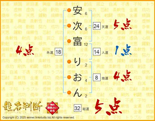 安(6画)次(6画)富(12画) り(2画)お(4画)ん(2画)