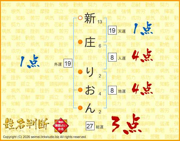 新(13画)庄(6画) り(2画)お(4画)ん(2画)