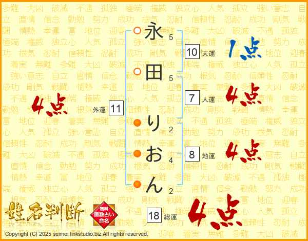 永(5画)田(5画) り(2画)お(4画)ん(2画)