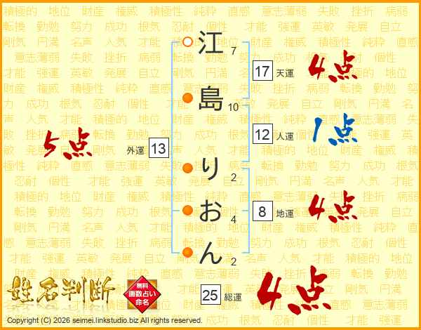 江(7画)島(10画) り(2画)お(4画)ん(2画)