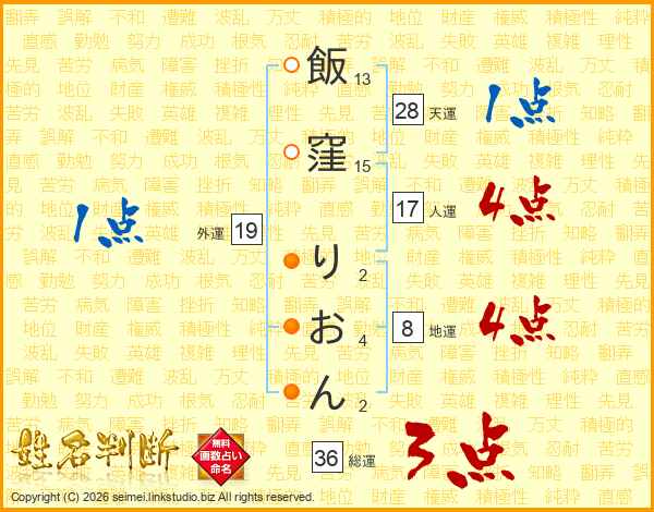 生活面を象徴する運勢です。外部から受ける影響力を表し、結婚運、家庭運や職場、環境への順応性を表します。総運から人運を引いた画数。姓や名が1文字の場合を除く。