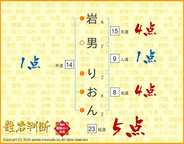 岩(8画)男(7画) り(2画)お(4画)ん(2画)