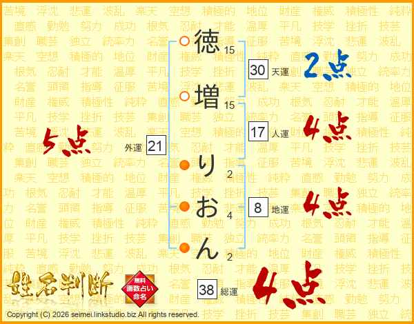 徳(15画)増(15画) り(2画)お(4画)ん(2画)