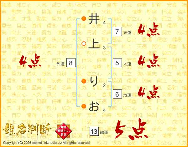 生活面を象徴する運勢です。外部から受ける影響力を表し、結婚運、家庭運や職場、環境への順応性を表します。総運から人運を引いた画数。姓や名が1文字の場合を除く。
