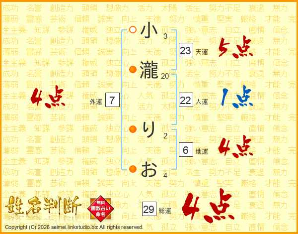 生活面を象徴する運勢です。外部から受ける影響力を表し、結婚運、家庭運や職場、環境への順応性を表します。総運から人運を引いた画数。姓や名が1文字の場合を除く。