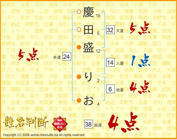 慶(15画)田(5画)盛(12画) り(2画)お(4画)