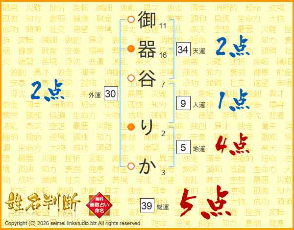 御(11画)器(16画)谷(7画) り(2画)か(3画)