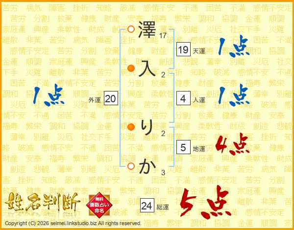 生活面を象徴する運勢です。外部から受ける影響力を表し、結婚運、家庭運や職場、環境への順応性を表します。総運から人運を引いた画数。姓や名が1文字の場合を除く。