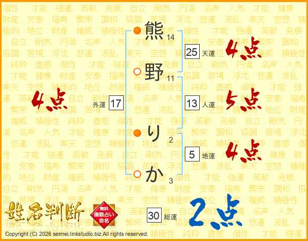 生活面を象徴する運勢です。外部から受ける影響力を表し、結婚運、家庭運や職場、環境への順応性を表します。総運から人運を引いた画数。姓や名が1文字の場合を除く。