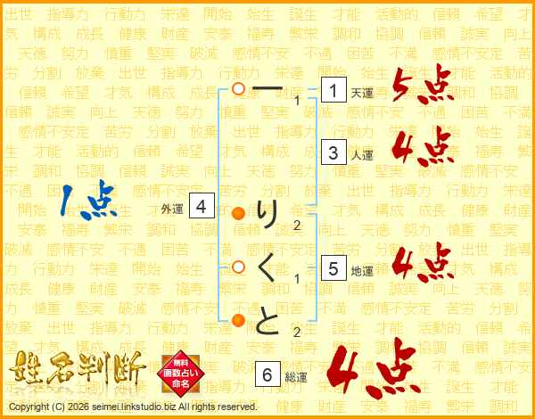 生活面を象徴する運勢です。外部から受ける影響力を表し、結婚運、家庭運や職場、環境への順応性を表します。総運から人運を引いた画数。姓や名が1文字の場合を除く。
