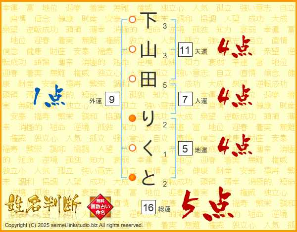 生活面を象徴する運勢です。外部から受ける影響力を表し、結婚運、家庭運や職場、環境への順応性を表します。総運から人運を引いた画数。姓や名が1文字の場合を除く。