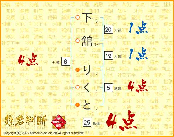 生活面を象徴する運勢です。外部から受ける影響力を表し、結婚運、家庭運や職場、環境への順応性を表します。総運から人運を引いた画数。姓や名が1文字の場合を除く。