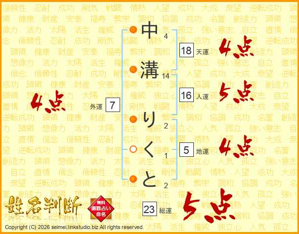 生活面を象徴する運勢です。外部から受ける影響力を表し、結婚運、家庭運や職場、環境への順応性を表します。総運から人運を引いた画数。姓や名が1文字の場合を除く。