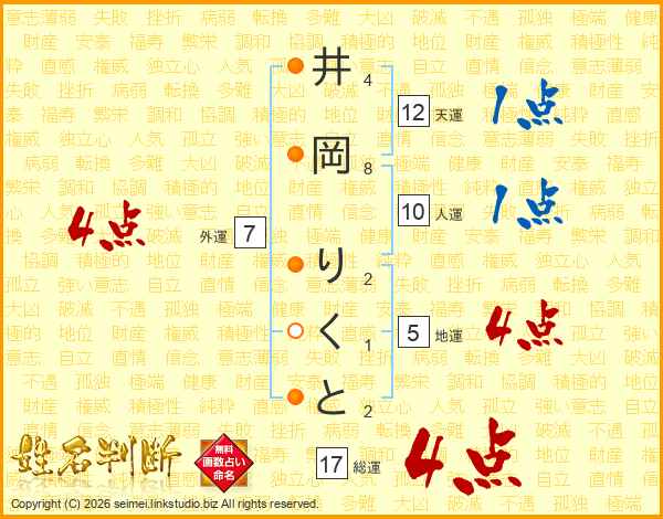 井(4画)岡(8画) り(2画)く(1画)と(2画)