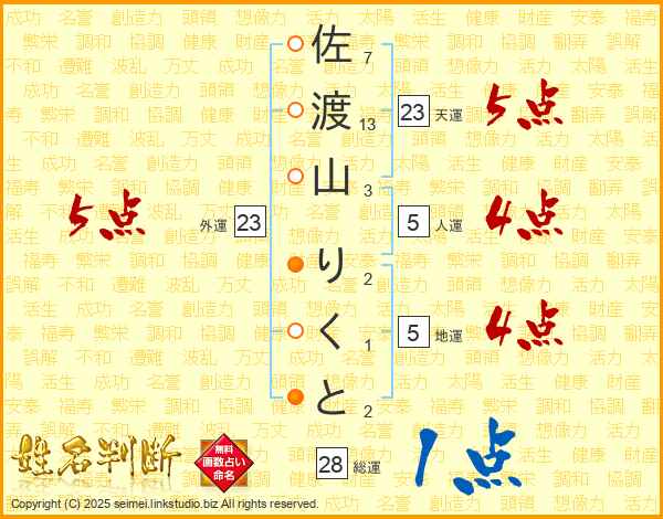 佐(7画)渡(13画)山(3画) り(2画)く(1画)と(2画)