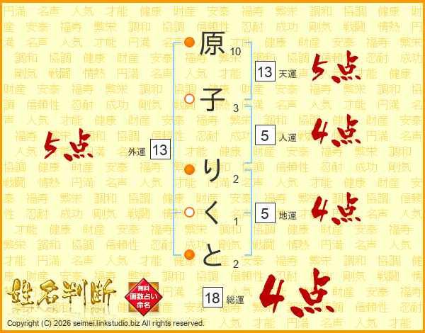 生活面を象徴する運勢です。外部から受ける影響力を表し、結婚運、家庭運や職場、環境への順応性を表します。総運から人運を引いた画数。姓や名が1文字の場合を除く。
