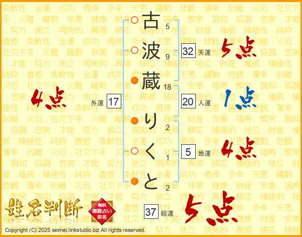 古(5画)波(9画)蔵(18画) り(2画)く(1画)と(2画)