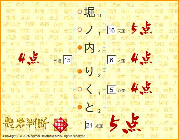 堀ノ内りくとさんの総運は21画の5点!