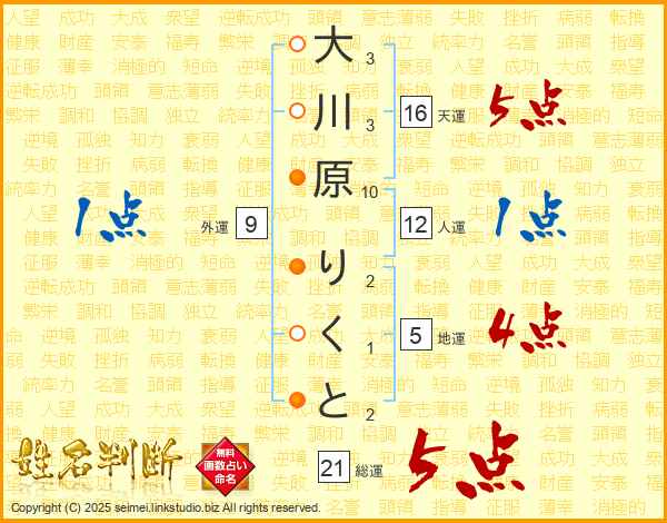 あなたの人生を表す1番重要な運勢です。生涯を通じて影響する総合運となり、主に50歳以降の晩年期に影響を及ぼします。苗字と名前の合計画数。