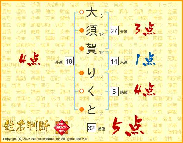 大(3画)須(12画)賀(12画) り(2画)く(1画)と(2画)