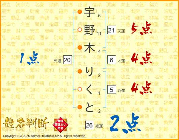 宇野木りくとさんの総運は26画の2点!