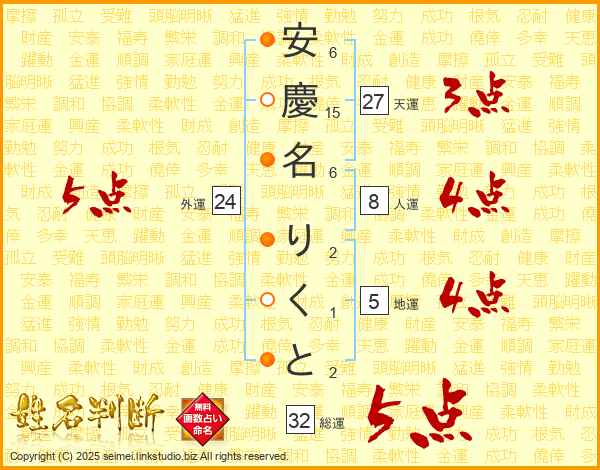 安(6画)慶(15画)名(6画) り(2画)く(1画)と(2画)