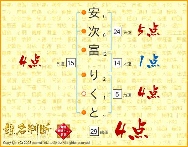 安(6画)次(6画)富(12画) り(2画)く(1画)と(2画)