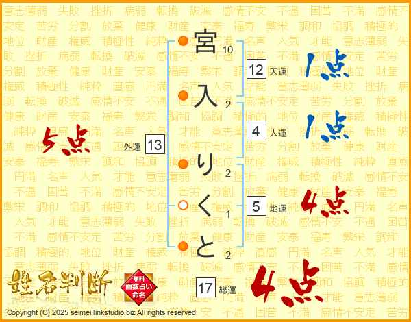 生活面を象徴する運勢です。外部から受ける影響力を表し、結婚運、家庭運や職場、環境への順応性を表します。総運から人運を引いた画数。姓や名が1文字の場合を除く。