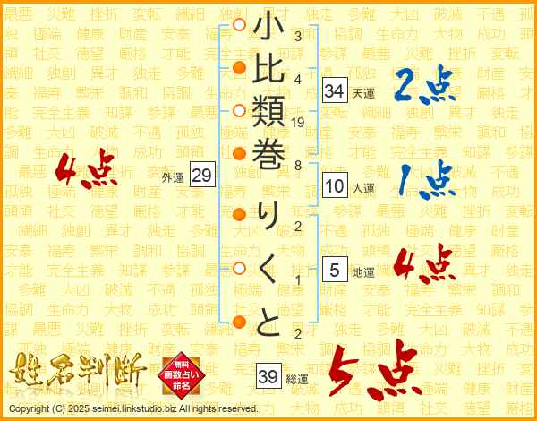 生活面を象徴する運勢です。外部から受ける影響力を表し、結婚運、家庭運や職場、環境への順応性を表します。総運から人運を引いた画数。姓や名が1文字の場合を除く。