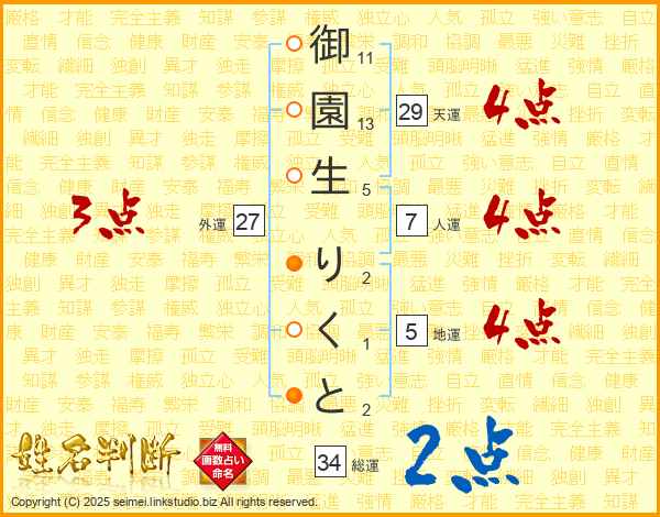 御(11画)園(13画)生(5画) り(2画)く(1画)と(2画)